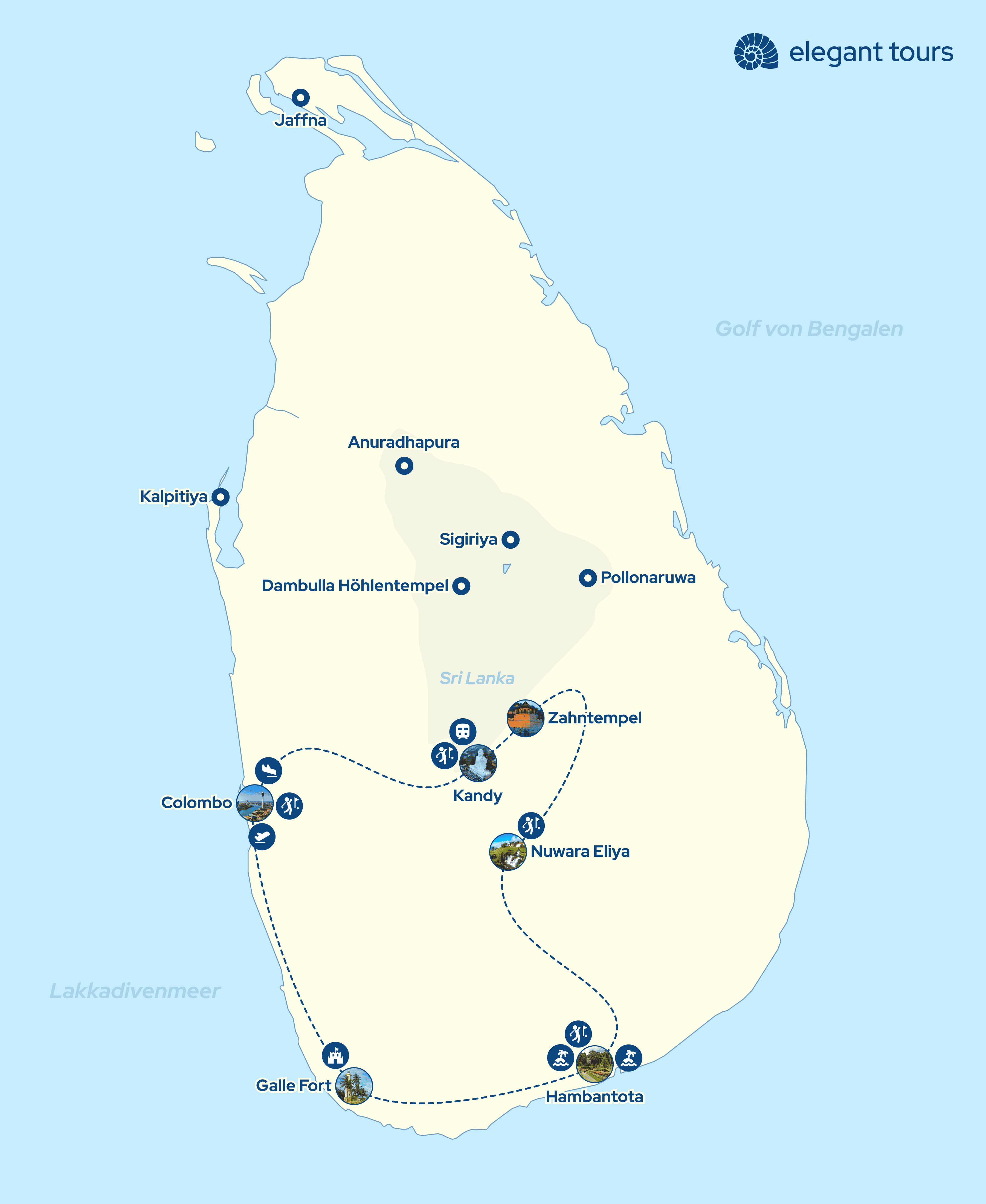 Mit unserer maßgeschneiderten Reiseplanung und persönlichem Service gestalten wir Ihre Golf- und Kulturreise durch Sri Lanka ganz nach Ihren individuellen Wünschen. Unternehmen Sie aufregende Jeep-Safaris durch die Nationalparks, beobachten Sie Elefanten und Leoparden in freier Wildbahn und lassen Sie Ihre Tage entspannt an den palmengesäumten Stränden des Indischen Ozeans ausklingen.